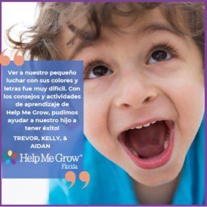 I called Help Me Grow Florida because my four-year-old son, Oliver was having behavioral problems at school. His teachers complained that he was biting and hitting other children. At home, I also noticed that loud noises seemed to bother him a lot. HMGF conducted a free developmental screening and helped me understand the results. They referred Oliver to his school’s inclusion specialist who provided support to his teachers and our family. HMGF also referred Oliver to an occupational therapist to work on sensory integration. Before calling HMGF, I had no idea how to address Oliver’s behavior but now I have the right tools to help him succeed.
